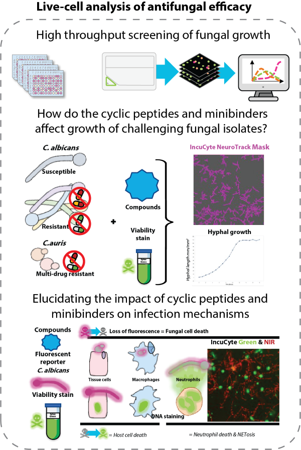 The research will combine the cutting-edge AI-based protein design with in vitro infection models and high-throughput live-cell imaging to evaluate the impact of developed Pma1 inhibitors on fungal viability, pathogenicity, and interactions with immune cells. In this way the inhibition of fungal growth will be monitored simultaneously with host cell viability, allowing us to assess whether Pma1 inhibitors represent Anti-Infectives or Anti-Virulence therapies. A state-of-the-art intestine-on-chip model established for Candida albicans infection will be used to assess antifungal and anti-virulence effects in a near physiological setting.
